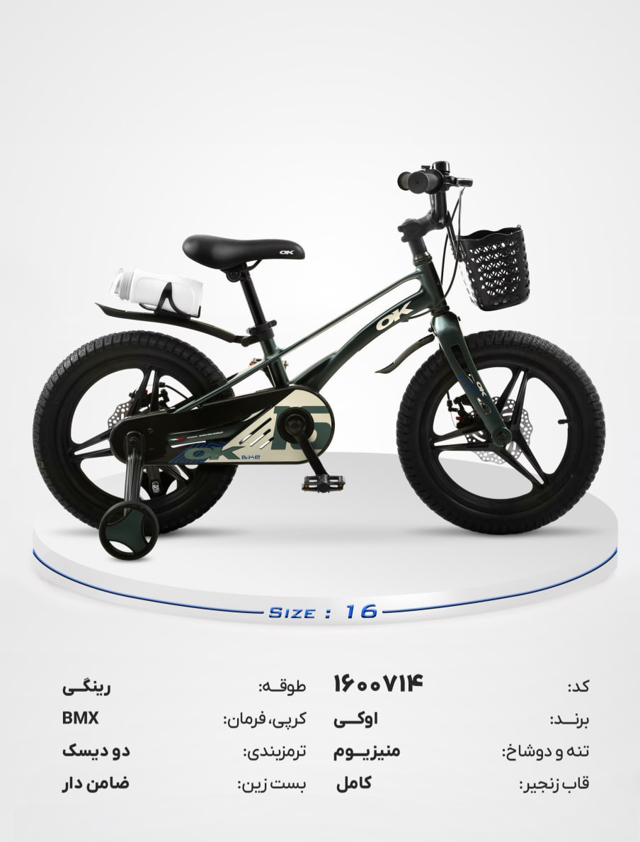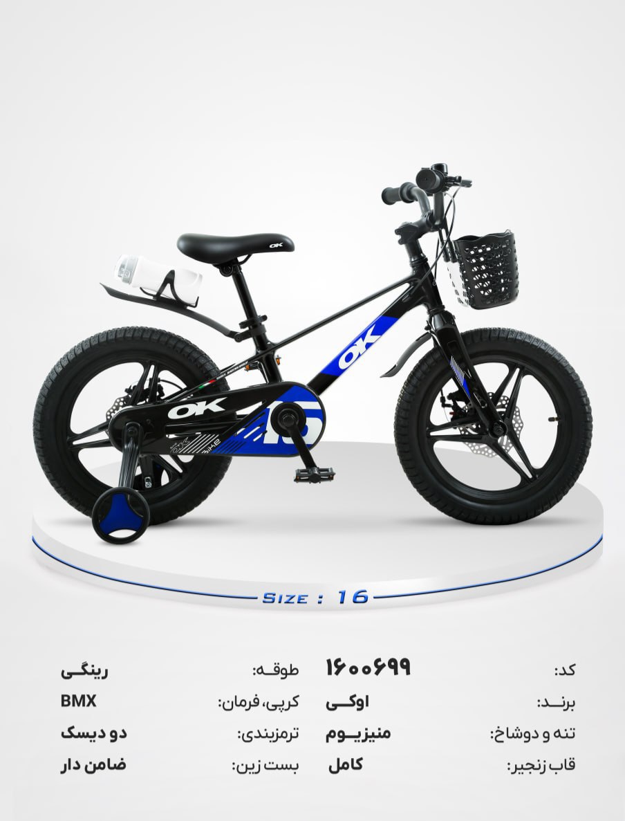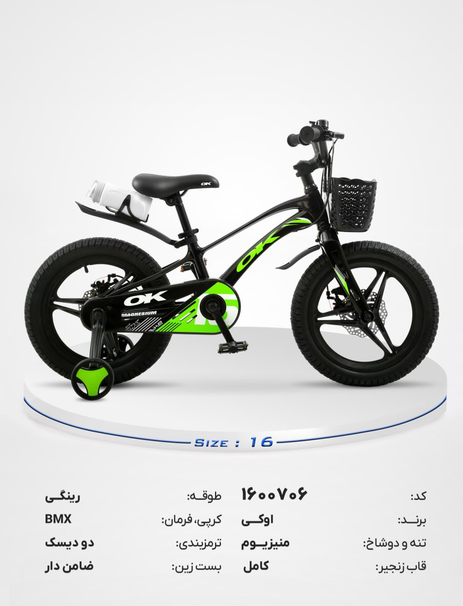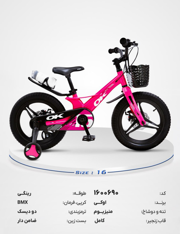 دوچرخه بچگانه OK سایز ۱۶ مدل BMX با ترمز دیسکی، چرخ کمکی و سبد جلو